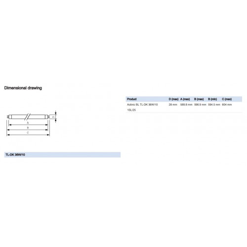 Bulb Description Philips Actinic BL TL-DK 36W/10 1SL/25, 286724 G13 [ Medium Bi-Pin Fluorescent] Base